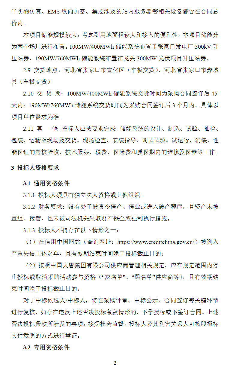 北极星储能网讯:2026年2月10日,大唐河北张家口发电厂百万新能源基地290MW/1160MWh配套储能项目发布磷酸铁锂电池储能系统采购招标公告,建设地点为河北省张家门市赤城县、宣化区。