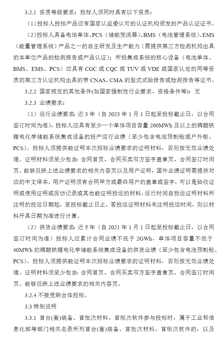 项目要求投标人近3年应具有至少一个单体项目容量200MWh及以上的储能系统集成设备的投产运行业绩(至少包含电池预制舱或户外柜、PCS);近5年应累计合同业绩不低于2GWh,单体项目容量不低于40MWh的储能系统集成设各的供货业绩(至少包含电池预制舱、PCS)。