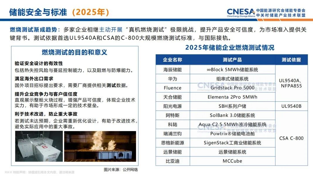 2025年,首份强制性国家标准《电化学储能电站安全规程》(GB 44240-2024)的实施,以及海外NFPA、UL标准的升级,标志着安全门槛被大幅拉高。比亚迪、宁德时代、阳光电源等头部企业纷纷开展真机燃烧极限测试,以提升安全透明度与市场信任。