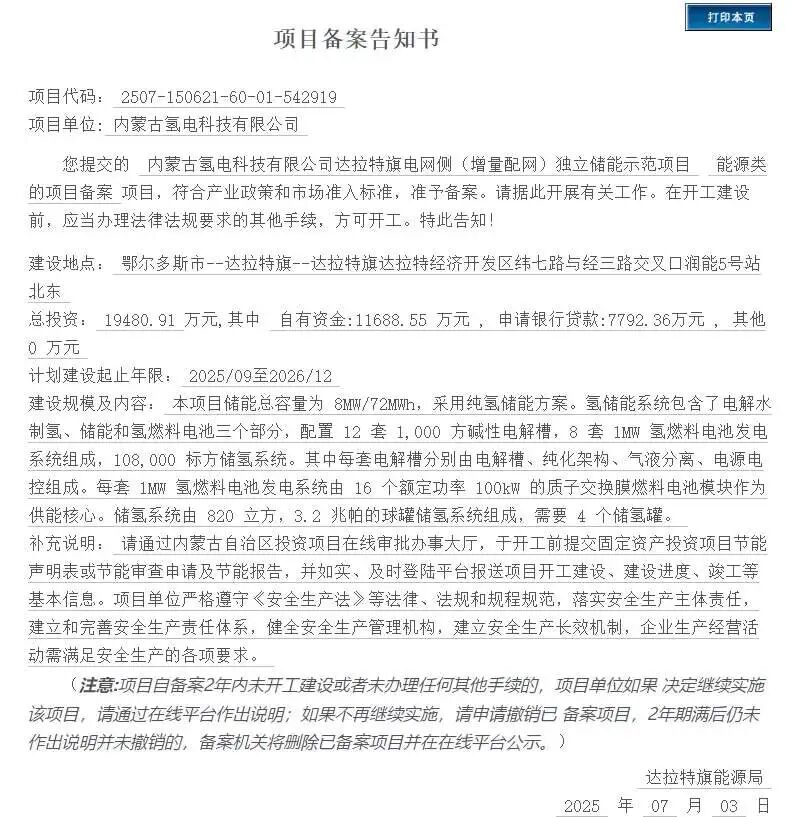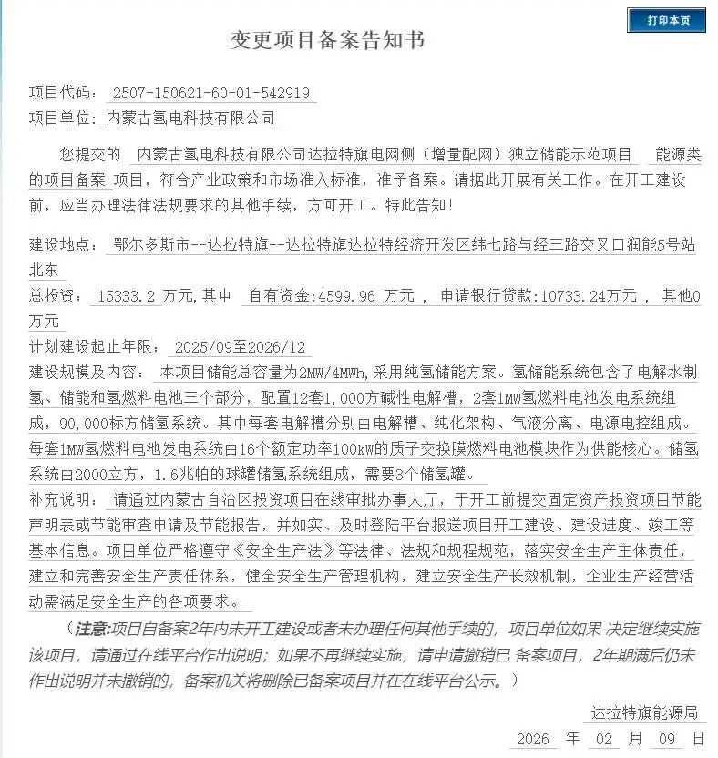 北极星氢能网获悉,2月9日,内蒙古自治区投资项目在线审批办事大厅信息显示,“内蒙古氢电科技有限公司达拉特旗电网侧(增量配网)独立储能示范项目”已完成变更备案。与去年7月首次备案相比,项目总投资、建设规模及关键设备配置均出现显著调整。