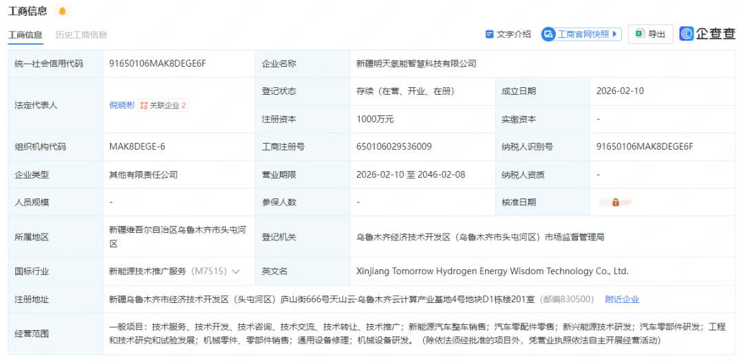 据企查查显示,近日,新疆明天氢能智慧科技有限公司成立,注册资本1000万元,法定代表人倪晓彬。