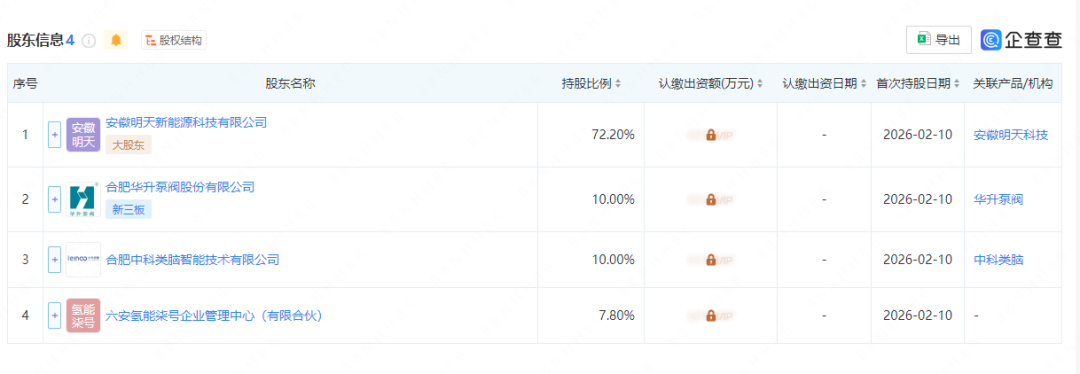 根据股东信息,新疆明天氢能智慧科技有限公司由安徽明天新能源科技有限公司、合肥华升泵阀股份有限公司、合肥中科类脑智能技术有限公司、六安氢能柒号企业管理中心(有限合伙)共同持股。