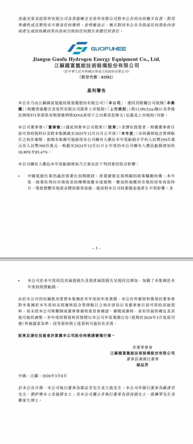 公告显示,造成亏损增加的主要原因包括中国内地氢能行业仍处于商业化初期,政策红利向市场需求的传导效应未达预期,整体市场需求释放节奏放缓,对公司的业绩表现产生不利影响。