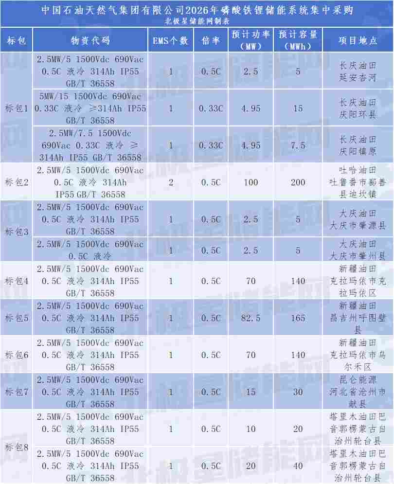 招标项目名称:中国石油天然气集团有限公司2026年磷酸铁锂储能系统集中采购(带量)招标编号:ZY26-Z309-JC0581. 招标条件本招标项目 中国石油天然气集团有限公司2026年磷酸铁锂储能系统集中采购(带量),招标人为中国石油天然气集团有限公司,招标项目资金来自 自筹资金(资金来源),出资比例为 100% 。该项目已具备招标条件,现对磷酸铁锂储能系统采购进行库内公开招标。2. 项目概况与招标范围2.1 招标产品范围:本项目共8个标包,详见下表。