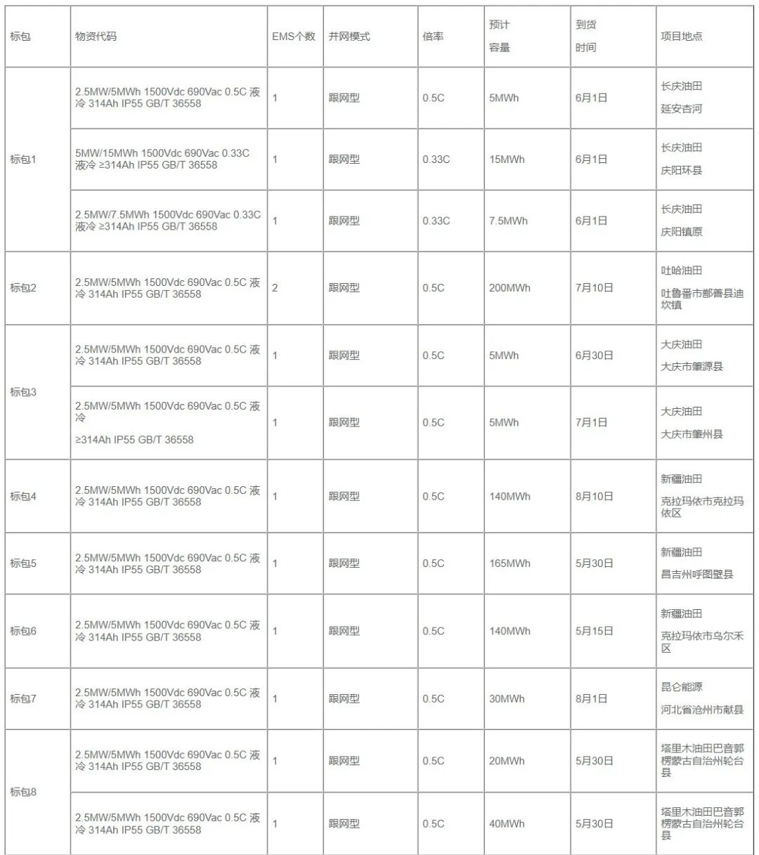 北极星储能网讯:2026年3月17日,中国石油天然气集团有限公司2026年磷酸铁锂储能系统集中采购(带量)招标,共包含8个标段,规模共385MW/773MWh,系统并网模式均为构网型。各标包均以“元/Wh”为单位报价,要求电芯≧314Ah,电池舱≧5MWh。项目不接受联合体投标。