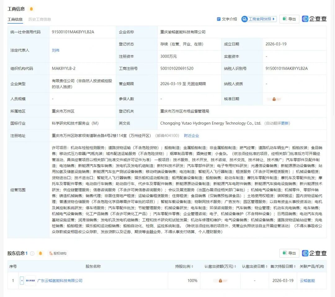 股东信息显示,该公司由广东云韬氢能科技有限公司100%持股,是后者的全资子公司。