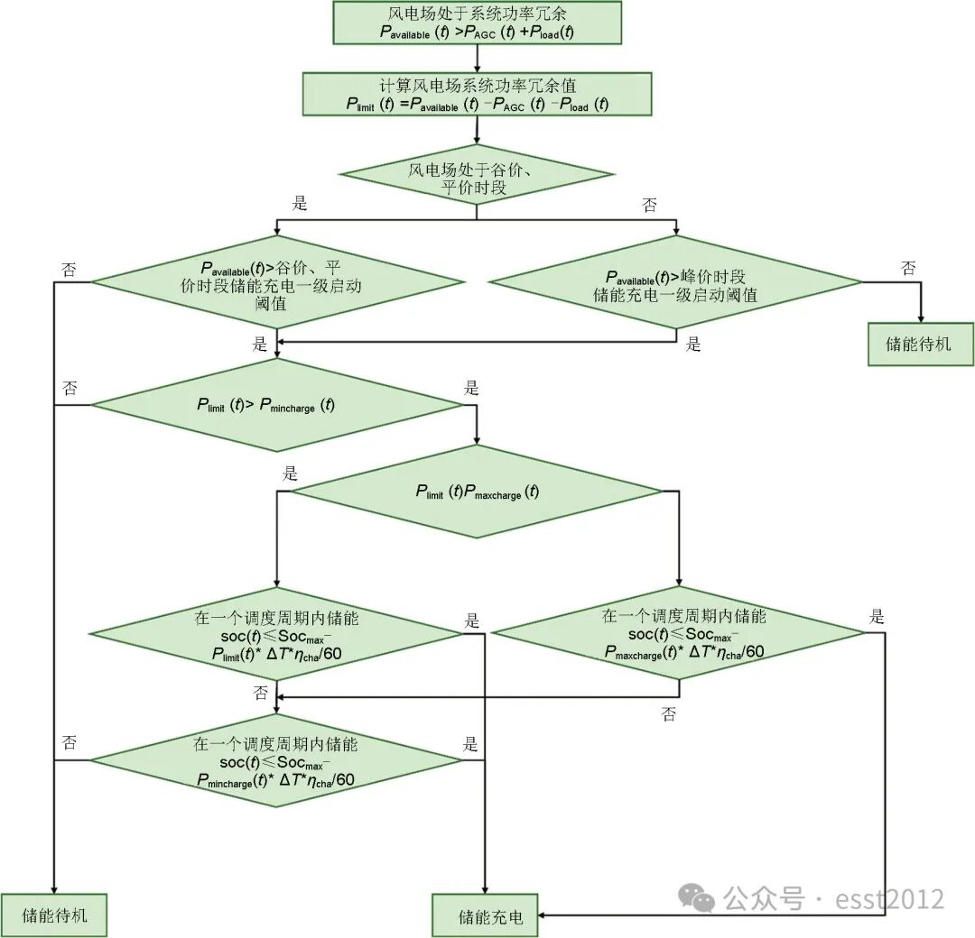 当风电场可用发电功率大于电网AGC调度指令与场站负荷用电功率之和时,所述控制方案综合考虑系统功率冗余量与储能系统运行边界条件,以判定储能系统的充电模式及风电场的实际发电功率。若系统功率冗余量小于储能系统的最小充电功率,则储能系统待机,不执行充电指令;若系统功率冗余量介于储能系统最小充电功率与最大充电功率之间,则储能系统执行充电指令,并根据其当前的SOC和调度周期来设定充电功率;而当系统功率冗余量超过储能系统的最大充电功率时,储能系统启动限功率充电模式以避免过载。同时,所述控制方案能够确保在整个调度周期内,储能系统的soc不会超过其设定的最大阈值。在执行上述充电指令之前,需判断风电场可用发电功率是否大于谷电价、平电价期间储能充电一级启动阈值和峰电价期间储能充电一级启动阈值,若是,则执行上述充电指令,反之,储能系统待机,不执行任何充电指令。具体运行控制策略如图2所示。