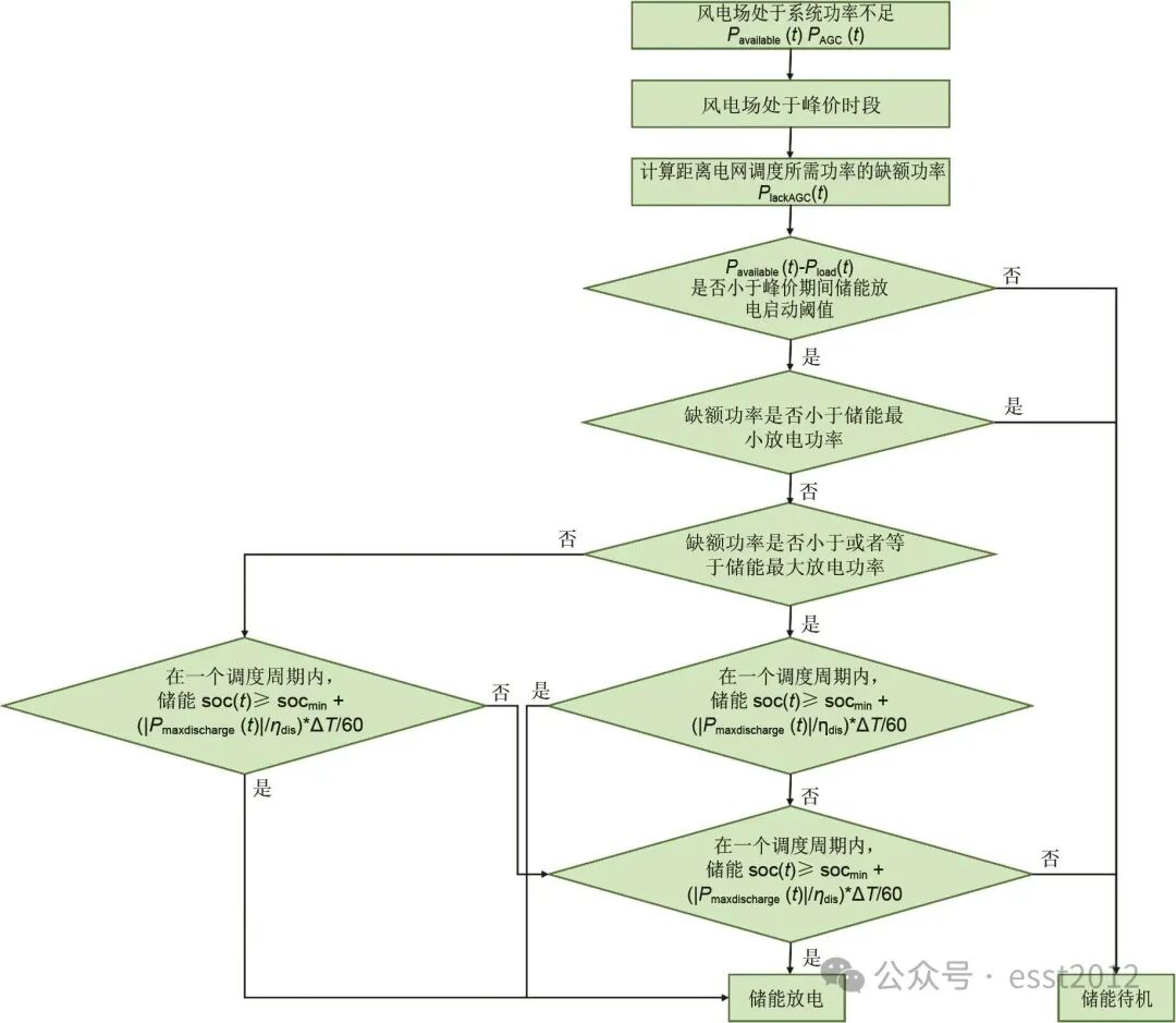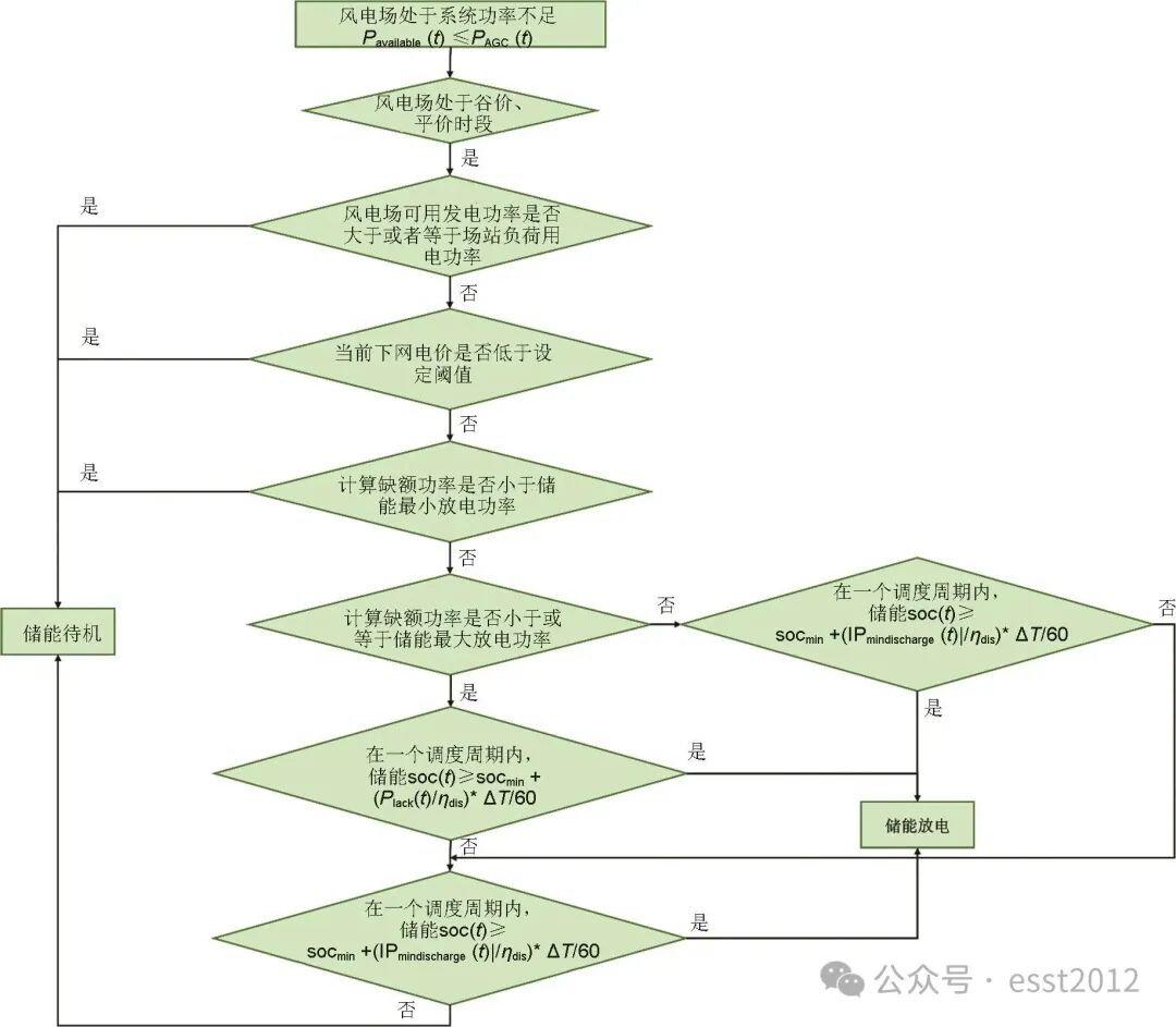 当风电系统可用发电功率小于场站负荷用电功率需求时,若下网电价高于设定电价阈值,储能系统执行放电供给场站负荷用电指令,若下网电价低于设定电价阈值,储能系统执行待机指令;当风电系统可用发电功率大于场站负荷用电功率需求时,在平电价、峰电价期间,储能系统执行放电上网指令以弥补电力缺口,确保高峰时段的电力需求得到满足,在执行放电上网指令之前,需判断风电场可用发电功率是否小于平电价、峰电价期间储能放电一级启动阈值,若是,则执行上述放电指令,反之,储能系统待机;在谷电价期间,储能系统执行待机指令。上述放电模式的放电功率根据储能系统的soc和电力缺口功率的大小进行动态调整,确保储能系统在满足放电需求的同时,避免过放或欠放,从而保持最佳的运行状态。若储能系统的soc低于设定最小值,则购买下网电以供给场站负荷用电需求。