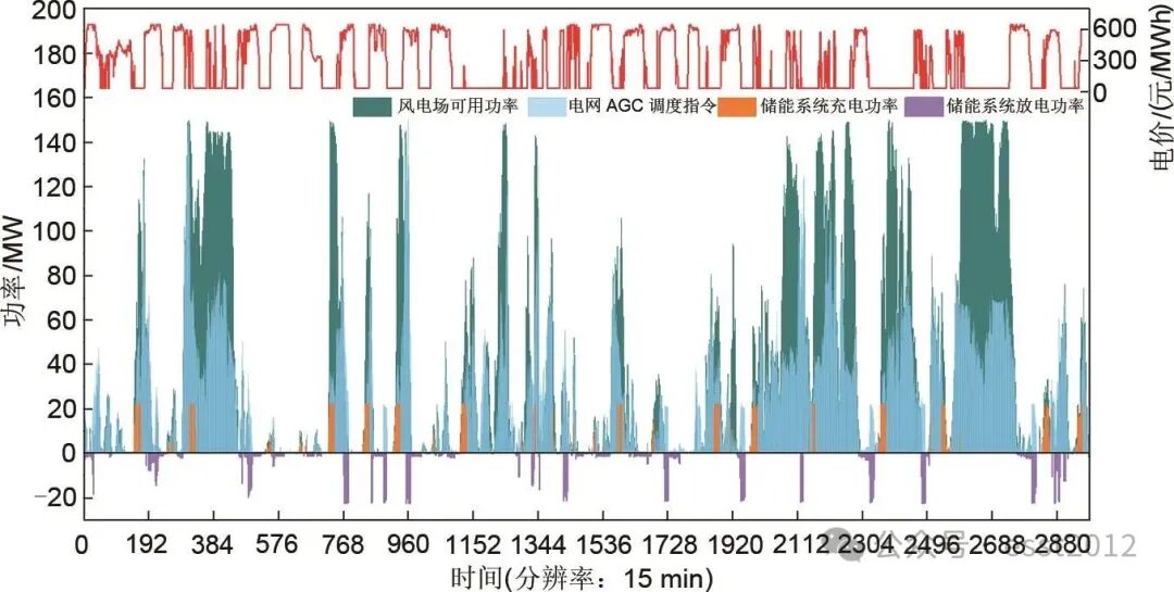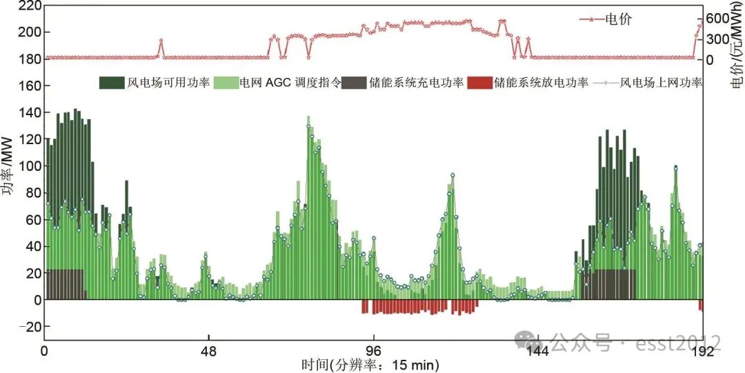 旺风季某典型月风电场与储能一体化调度仿真结果如图8所示,该典型月风电场市场交易电价与枯风季类似,也在40~650元/MWh区间波动变化,呈现午间电价低、晚间电价高的特点。由于风电大发,电力供过于求,与上述枯风季某典型月相比,市场交易电价明显下跌。经仿真测算,该旺风季典型月内,风电场可发电量为4315.7×104kWh,实际电网AGC调度电量为2898.5×104kWh,在电价低谷时段,储能累计充电149.0×104kWh,在电价较高时或风电场出力不足时,储能累计放电120.7×104kWh,风电场实际上网电量为2701.4×104kWh,风电场售电收益仅增加至365.3万元,风电场购网电量为0.099×104kWh,相比风电场原始购网电量2.8×104kWh,减少了2.701×104kWh,大幅降低了运营成本。同时,储能调峰产生的放电收益为54.64万元,占风电场售电收益的14.9%。