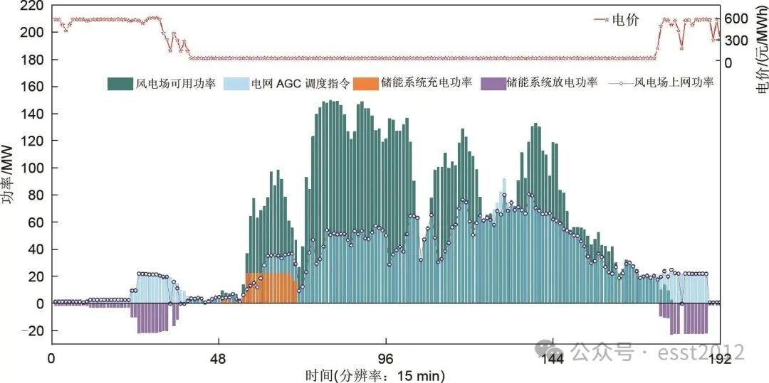 旺风季某连续典型日风电场出力变化情况如图10所示,在谷电价期间,风电场可用功率大于电网AGC调度指令时,储能充电存储多余电量,在峰电价期间,储能放电上网,增加售电收益,实现峰谷套利。旺风季该连续典型日电价相对低迷,其中40元/MWh的电价占比达59%,因此,在风电场出力不足且电价较低时段(26~68 min以及130~153 min),储能不进行放电套利,获利空间较为有限。