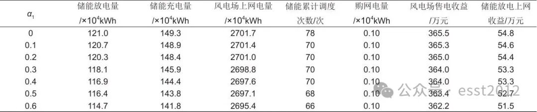 当不设置谷电价、平电价期间储能充电一级启动系数(α1)时,储能累计调度78次,此时风电场上网电量为2701.7×104 kWh,如表4所示。当α1从0逐渐增加至0.1时,储能的调度次数减少至70次;随着α1继续增加,储能的调度次数趋于稳定,但储能的充电量和放电量逐渐减小,相应地影响风电场的上网电量和售电收益。因此,α1值较大,可以避免储能频繁调度问题,但会减弱调峰效果,使风电场收益下降;α1值较小,可以充分发挥储能低价充电的功能,但会引发储能频繁调度,导致电池寿命损耗问题。因此,需要设置合理的α1值,引导储能低价充电,同时避免频繁充放电动作,从而降低电池损耗,本工作中α1取值为0.1。