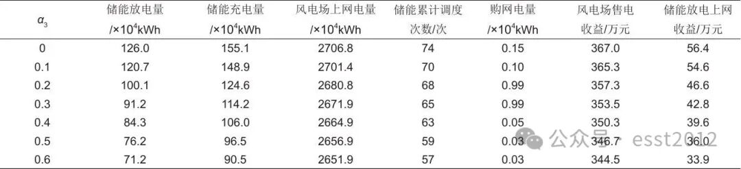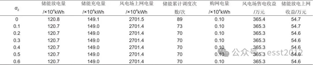 当不设置峰电价期间储能放电一级启动系数(α3)时,储能的调度次数为74次,如表5所示。当α3从0逐渐增加至0.1时,受储能放电限制,调度次数降至70次,同时,风电场的上网电量下降;当α3从0.1逐渐增加至0.6时,平电价、峰电价期间储能放电限制不断增加,导致储能充放电电量快速下降,从而降低风电场上网电量,影响风电场的售电收益。因此,α3值的设置对于峰电价期间储能放电套利的影响十分显著:α3较小,会引起储能频繁调度,导致电池损耗问题;α3较大,会导致储能放电受限,从而大幅降低风电场售电收益。因此,需要设置合理的α3值,最大程度地实现峰谷套利,同时减少储能频繁调度带来的电池损耗问题,本论文中α3取值为0.1。